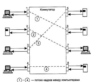 7. Передача байт кадра процессором выходного порта в сеть. Этапы 2 и 3 совместить во времени нельзя, так как без знания номера выходного порта операция коммутации матрицы не имеет смысла. По сравнению с режимом полной буферизации кадра, также приведенном на рис. 4.25, экономия от конвейеризации получается ощутимой. Однако главной причиной повышения производительности сети при использовании коммутатора является параллельная обработка нескольких кадров. Этот эффект иллюстрирует рис. 4.26. На рисунке изображена идеальная в отношении повышения производительности ситуация, когда четыре порта из восьми передают данные с максимальной для протокола Ethernet скоростью 10 Мб/с, причем они передают эти данные на остальные четыре порта коммутатора не конфликтуя - потоки данных между узлами сети распределились так, что для каждого принимающего кадры порта есть свой выходной порт. Если коммутатор успевает обрабатывать входной трафик даже при максимальной интенсивности поступления кадров на входные порты, то общая производительность коммутатора в приведенном примере составит 4*10 = 40 Мбит/с, а при обобщении примера для N портов - (N/2)*l0 Мбит/с. Говорят, что коммутатор предоставляет каждой станции или сегменту, подключенным к его портам, выделенную пропускную способность протокола. Естественно, что в сети не всегда складывается такая ситуация, которая изображена на рис. 4.26. Если двум станциям, например станциям, подключенным к портам 3 и 4, одновременно нужно записывать данные на один и тот же сервер, подключенный к порту 8, то коммутатор не сможет выделить каждой станции поток данных по 10 Мбит/с, так как порт 8 не может передавать данные со скоростью 20 Мбит/с. Кадры станций будут ожидать во внутренних очередях входных портов 3 и 4, когда освободится порт 8 для передачи очередного кадра. Очевидно, хорошим решением для такого распределения потоков данных было бы подключение сервера к более высокоскоростному порту, например Fast Ethernet.
