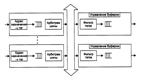 Рис. 4.33. Архитектура коммутатора с общей шиной Кадр должен передаваться по шине небольшими частями, по нескольку байт, чтобы передача кадров между несколькими портами происходила в псевдопараллельном режиме, не внося задержек в передачу кадра в целом. Размер такой ячейки данных определяется производителем коммутатора. Некоторые производители, например LANNET или Centillion, выбрали в качестве порции данных, переносимых за одну операцию по шине, ячейку АТМ с ее полем данных в 48 байт. Такой подход облегчает трансляцию протоколов локальных сетей в протокол АТМ, если коммутатор поддерживает эти технологии. Входной блок процессора помещает в ячейку, переносимую по шине, тэг, в котором указывает номер порта назначения. Каждый выходной блок процессора порта содержит фильтр тэгов, который выбирает тэги, предназначенные данному порту. Шина, так же как и коммутационная матрица, не может осуществлять промежуточную буферизацию, но так как данные кадра разбиваются на небольшие ячейки, то задержек с начальным ожиданием доступности выходного порта в такой схеме нет - здесь работает принцип коммутации пакетов, а не каналов.
