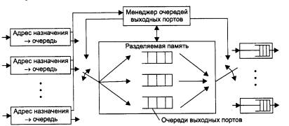 Рис. 4.34. Архитектура разделяемой памяти Входные блоки процессоров портов соединяются с переключаемым входом разделяемой памяти, а выходные блоки этих же процессоров соединяются с переключаемым выходом этой памяти. Переключением входа и выхода разделяемой памяти управляет менеджер очередей выходных портов. В разделяемой памяти менеджер организует несколько очередей данных, по одной для каждого выходного порта. Входные блоки процессоров передают менеджеру портов запросы на запись данных в очередь того порта, который соответствует адресу назначения пакета. Менеджер по очереди подключает вход памяти к одному из входных блоков процессоров и тот переписывает часть данных кадра в очередь определенного выходного порта. По мере заполнения очередей менеджер производит также поочередное подключение выхода разделяемой памяти к выходным блокам процессоров портов, и данные из очереди переписываются в выходной буфер процессора. Память должна быть достаточно быстродействующей для поддержания скорости переписи данных между N портами коммутатора. Применение общей буферной памяти, гибко распределяемой менеджером между отдельными портами, снижает требования к размеру буферной памяти процессора порта.