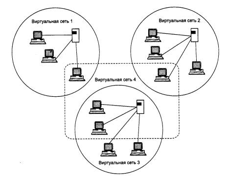 Виртуальные локальные сети Кроме своего основного назначения - повышения пропускной способности связей в сети - коммутатор позволяет локализовывать потоки информации в сети, а также контролировать эти потоки и управлять ими, опираясь на механизм пользовательских фильтров. Однако пользовательский фильтр может запретить передачи кадров только по конкретным адресам, а широковещательный трафик он передает всем сегментам сети. Так требует алгоритм работы моста, который реализован в коммутаторе, поэтому сети, созданные на основе мостов и коммутаторов, иногда называют плоскими - из-за отсутствия барьеров на пути широковещательного трафика. Технология виртуальных локальных сетей (Virtual LAN, VLAN), которая появилась несколько лет тому назад в коммутаторах, позволяет преодолеть указанное ограничение. Виртуальной сетью называется группа узлов сети, трафик которой, в том числе и широковещательный, на канальном уровне полностью изолирован от других узлов сети (рис. 4.39). Это означает, что передача кадров между разными виртуальными сетями на основании адреса канального уровня невозможна, независимо от типа адреса - уникального, группового или широковещательного. В то же время внутри виртуальной сети кадры передаются по технологии коммутации, то есть только на тот порт, который связан с адресом назначения кадра. Виртуальные сети могут пересекаться, если один или несколько компьютеров входят в состав более чем одной виртуальной сети. На рис. 4.39 сервер электронной почты входит в состав 3 и 4 виртуальных сетей. Это значит, что его кадры передаются коммутаторами всем компьютерам, входящим в эти сети. Если же какой-то компьютер входит в состав только виртуальной сети 3, то его кадры до сети 4 доходить не будут, но он может взаимодействовать с компьютерами сети 4 через общий почтовый сервер. Такая схема не полностью защищает виртуальные сети друг от друга -так, широковещательный шторм, возникший на сервере электронной почты, захлестнет сеть 3 и сеть 4.
