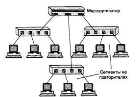 Рис. 4.40. Интерсеть, состоящая из сетей, построенных на основе повторителей Изменение состава сегментов (переход пользователя в другую сеть, дробление крупных сегментов) при таком подходе подразумевает физическую перекоммутацию разъемов на передних панелях повторителей или в кроссовых панелях, что не очень удобно в больших сетях - много физической работы, к тому же высока вероятность ошибки. Поэтому для устранения необходимости физической перекоммутации узлов стали применять многосегментные концентраторы, рассмотренные в разделе 4.2.2. Возникла возможность программировать состав разделяемого сегмента без физической перекоммутации. Однако решение задачи изменения состава сегментов с помощью концентраторов накладывает большие ограничения на структуру сети - количество сегментов такого повторителя обычно невелико, поэтому выделить каждому узлу свой сегмент, как это можно сделать с помощью коммутатора, нереально. Кроме того, при таком подходе вся работа по передаче данных между сегментами ложится на маршрутизаторы, а коммутаторы со своей высокой производительностью остаются не у дел. Поэтому сети, построенные на основе повторителей с конфигурационной коммутацией, по-прежнему основаны на разделении среды передачи данных между большим количеством узлов, и, следовательно, обладают гораздо меньшей производительностью по сравнению с сетями, построенными на основе коммутаторов. При использовании технологии виртуальных сетей в коммутаторах одновременно решаются две задачи: