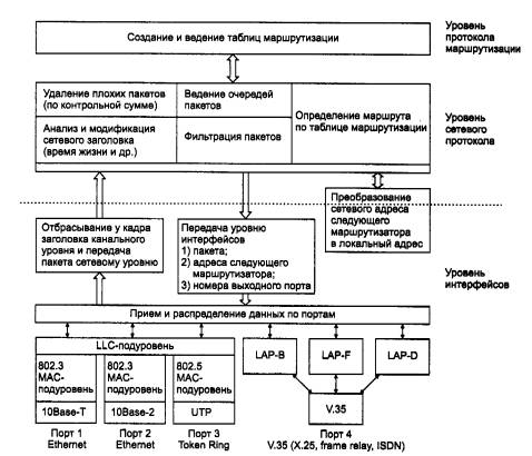 Уровень интерфейсов На нижнем уровне маршрутизатор, как и любое устройство, подключенное к сети, обеспечивает физический интерфейс со средой передачи, включая согласование уровней электрических сигналов, линейное и логическое кодирование, оснащение определенным типом разъема. В разных моделях маршрутизаторов часто предусматриваются различные наборы физических интерфейсов, представляющих собой комбинацию портов для подсоединения локальных и глобальных сетей. С каждым интерфейсом для подключения локальной сети неразрывно связан определенный протокол канального уровня - например, Ethernet, Token Ring, FDDI. Интерфейсы для присоединения к глобальным сетям чаще всего определяют только некоторый стандарт физического уровня, над которым в маршрутизаторе могут работать различные протоколы канального уровня. Например, глобальный порт может поддерживать интерфейс V.35, над которым могут работать протоколы канального уровня: LAP-B (используемый в сетях X.25), LAP-F (используемый в сетях frame relay), LAP-D (используемый в сетях ISDN). Разница между интерфейсами локальных и глобальных сетей объясняется тем, что технологии локальных сетей работают по собственным стандартам физического уровня, которые не могут, как правило, использоваться в других технологиях, поэтому интерфейс для локальной сети представляет собой сочетание физического и канального уровней и носит название по имени соответствующей технологии - например, интерфейс Ethernet. Интерфейсы маршрутизатора выполняют полный набор функций физического и канального уровней по передаче кадра, включая получение доступа к среде (если это необходимо), формирование битовых сигналов, прием кадра, подсчет его контрольной суммы и передачу поля данных кадра верхнему уровню, в случае если контрольная сумма имеет корректное значение. ПРИМЕЧАНИЕ Как и любой конечный узел, каждый порт маршрутизатора имеет собственный аппаратный адрес (в локальных сетях МАС - адрес), по которому ему и направляются кадры, требующие маршрутизации, другими узлами сети. Перечень физических интерфейсов, которые поддерживает та или иная модель маршрутизатора, является его важнейшей потребительской характеристикой. Маршрутизатор должен поддерживать все протоколы канального и физического уровней, используемые в каждой из сетей, к которым он будет непосредственно присоединен. На рис. 5.3 показана функциональная модель маршрутизатора с четырьмя портами, реализующими следующие физические интерфейсы: 10Base-T и 10Base-2 для двух портов Ethernet, UTP для Token Ring и V.35, над которым могут работать протоколы LAP-B, LAP-D или LAP-F, обеспечивая подключение к сетям Х.25, ISDN или frame relay. Кадры, которые поступают на порты маршрутизатора, после обработки соответствующими протоколами физического и канального уровней, освобождаются от заголовков канального уровня. Извлеченные из поля данных кадра пакеты передаются модулю сетевого протокола.