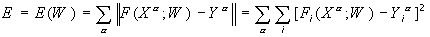 Постановка задачи оптимизации при обучении нейронной сети Пусть имеется нейронная сеть, выполняющая преобразование F:XY векторов X из признакового пространства входов X в вектора Y выходного пространства Y. Сеть находится в состоянии W из пространства состояний W. Пусть далее имеется обучающая выборка (X,Y), = 1 p. Рассмотрим полную ошибку E, делаемую сетью в состоянии W.