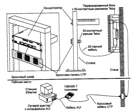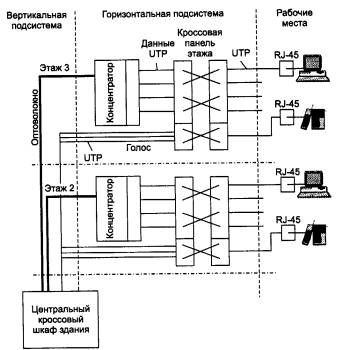 Рис. 4.3. Структура кабельной системы этажа и здания Медный провод, в частности неэкранированная витая пара, является предпочтительной средой для горизонтальной кабельной подсистемы, хотя, если пользователям нужна очень высокая пропускная способность или кабельная система прокладывается в агрессивной среде, для нее подойдет и волоконно-оптический кабель. Коаксиальный кабель - это устаревшая технология, которой следует избегать, если только она уже широко не используется на предприятии. Беспроводная связь является новой и многообещающей технологией, однако из-за сравнительной новизны и низкой помехоустойчивости лучше ограничить масштабы ее использования неответственными областями. При выборе кабеля принимаются во внимание следующие характеристики: полоса пропускания, расстояние, физическая защищенность, электромагнитная помехозащищенность, стоимость. Кроме того, при выборе кабеля нужно учитывать, какая кабельная система уже установлена на предприятии, а также какие тенденции и перспективы существуют на рынке в данный момент. Экранированная витая пара, STP, позволяет передавать данные на большее расстояние и поддерживать больше узлов, чем неэкранированная. Наличие экрана делает ее более дорогой и не дает возможности передавать голос. Экранированная витая пара используется в основном в сетях, базирующихся на продуктах IBM и Token Ring, и редко подходит к остальному оборудованию локальных сетей. Неэкранированная витая пара UTP по характеристикам полосы пропускания и поддерживаемым расстояниям также подходит для создания горизонтальных подсистем. Но так как она может передавать данные и голос, она используется чаще. Однако и коаксиальный кабель все еще остается одним из возможных вариантов кабеля для горизонтальных подсистем. Особенно в случаях, когда высокий уровень электромагнитных помех не позволяет использовать витую пару или же небольшие размеры сети не создают больших проблем с эксплуатацией кабельной системы. Толстый Ethernet обладает по сравнению с тонким большей полосой пропускания, он более стоек к повреждениям и передает данные на большие расстояния, однако к нему сложнее подсоединиться и он менее гибок. С толстым Ethernet сложнее работать, и он мало подходит для горизонтальных подсистем. Однако его можно использовать в вертикальной подсистеме в качестве магистрали, если оптоволоконный кабель по каким-то причинам не подходит. Тонкий Ethernet - это кабель, который должен был решить проблемы, связанные с применением толстого Ethernet. До появления стандарта 10Base-T тонкий Ethernet был основным кабелем для горизонтальных подсистем. Тонкий Ethernet проще монтировать, чем толстый. Сети на тонком Ethernet можно быстро собрать, так как компьютеры соединяются друг с другом непосредственно. Главный недостаток тонкого Ethernet - сложность его обслуживания. Каждый конец кабеля должен завершаться терминатором 50 Ом. При отсутствии терминатора или утере им своих рабочих свойств (например, из-за отсутствия контакта) перестает работать весь сегмент сети, подключенный к этому кабелю. Аналогичные последствия имеет плохое соединение любой рабочей станции (осуществляемое через Т-коннектор). Неисправности в сетях на тонком Ethernet сложно локализовать. Часто приходится отсоединять Т-коннектор от сетевого адаптера, тестировать кабельный сегмент и затем 