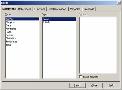 На панели инструментов слева находится кнопка, кратковременное нажатие которой откроет диалог, а более длительное – выведет меню возможных полей для вставки в документ. При нажатии на кнопку более одной секунды появится меню. В нём выбирается тип поля, которое нужно вставить в документ (в текущей позиции курсора). Если в меню нет требуемого поля, или же нужно настроить вставляемое поле, то удобнее вызвать диалог кратковременным нажатием на кнопку или при выборе в меню Other ., из меню Insert–Fields–Other ., а также сочетанием клавиш Ctrl-F2.