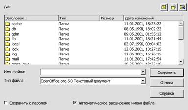 Для того чтобы введённый текст можно было использовать не единожды, применяется сохранение и открытие документов. Всегда, когда нужно использовать документ и в дальнейшем (а это самый распространенный случай), документ сохраняется на постоянном носителе, при этом ему присваивается уникальное в пределах того же каталога имя, состоящее из собственно имени и расширения. Расширение назначается в зависимости от типа документа. По нему можно узнать, какой программой открывается файл. Например, файлы с расширением XLS открываются StarOffice Calc, а с расширением DOC — StarOffice Writer. Сохранить документ можно при помощи меню File (пункт Save), кнопки Save на панели инструментов или горячей клавиши Ctrl-S. Если документ сохранён и не требует действия, кнопка на панели инструментов будет неактивной. При первом сохранении документа откроется диалог, где требуется ввести имя файла и, возможно, указать тип документа (если таковой по умолчанию не устраивает). Будущее или новое название файла вводится в поле FileName. Его можно вводить с указанием относительного или абсолютного пути – система при этом будет по мере возможности дополнять название возможными вариантами. Для перехода в какой-