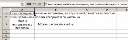 Для ввода данных выбираем ячейку и просто вводим то, что требуется. Набираемый текст будет отображаться в ячейке, куда вводим текст, и в строке ввода (сверху), которая особенно полезна с учетом того, что ячейка может содержать больше символов, чем позволяет отобразить ее текущая ширина. Если соседние ячейки справа не содержат значений, то введенная строка будет отображаться полностью, иначе будет отображена только часть строки и в ячейке появится красная стрелочка. Чтобы отобразить информацию целиком, необходимо либо растянуть ячейку по ширине, либо разрешить разрыв строк. Изменить ширину (высоту) строки можно несколькими способами: