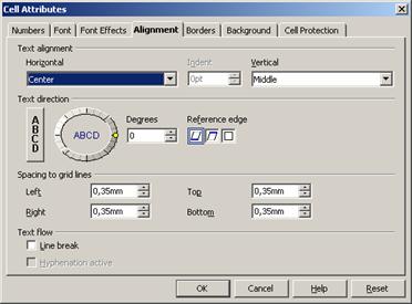 В этом же окне можно задать вертикальное и горизонтальное выравнивание текста и направление письма (угол поворота текста). Выравнивание позволяет определить положение текста в ячейке (слева, справа, по центру, снизу, сверху). Направление письма позволяет писать в ячейках под заданным углом. Следует отметить, что если текст начинается со знака “=”, то он не отображается в ячейке, поскольку StarOffice Calc считает такой текст формулой. Если нужно напечатать текст, начинающийся со знака “=”, то необходимо самым первым символом поставить знак одинарной кавычки. Если есть необходимость начать строку со знака кавычки, то необходимо напечатать кавычку два раза.