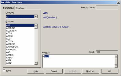 Для удобства написания формул в StarOffice Calc разработан автопилот функций. В окне автопилота можно набирать функции и проверять правильность их набора. В зависимости от выбора категории список доступных функций будет изменяться. Кроме перечисленных выше категорий, для удобства добавлены All и LastUsed.