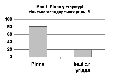 Характерною особливістю структури сільськогосподар- ських угідь є висока питома вага орних земель (більше 80%). Інші площі використовуються під багаторічні насадження (2,7%), сінокоси (5,1%) і пасовища (11,4%) (мал.1)