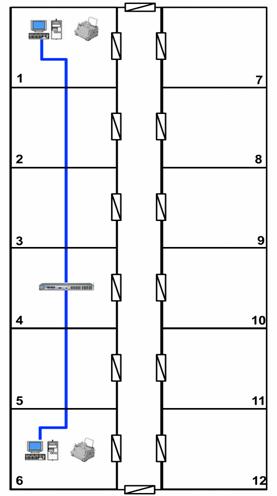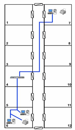 оборудование корпусов: 3 рабочих станций 1 коммутатор 1 принтер соединенных через принт-сервер 1 принт-сервер 1 индивидуальный. принтер расчетная длина кабеля 90м (макс. длина отрезка 29м) 4 розетки RJ-45 |