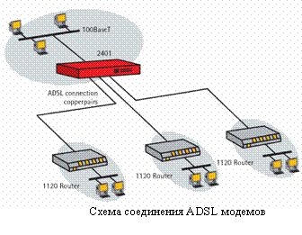 Со стороны сервера нам надо использовать Модемные концентратор ADSL т.к. нам необходимо сооздать связь с 5 зданиями. Концентратор доступа TELiNDUS 2401 содержит в себе 8 ADSL модемов и также сменный интерфейс Backbone, к которому подключается модуль для связи с сетью Fast Ethernet. Этот концентратор обеспечивает скорость до 12Мбит/с от себя и до 1Мбит/с обратно на каждый модем, на расстоянии до 10 км. Его установим в серверную стойку в техническом корпусе.