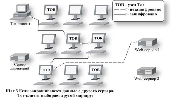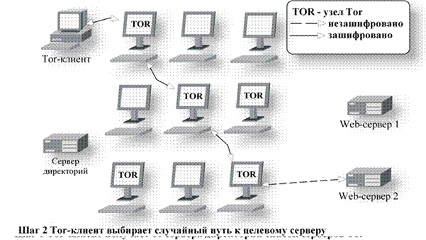 Принцип обеспечения анонимности строится на базе распределенной системы серверов (так называемых нод), между которыми в зашифрованном виде передаются данные. Для соединения обычно используется три сервера, которые образуют временную цепочку. Каждый сервер выбирается случайным образом, при этом он «знает» только то, от какого звена получил данные и кому они предназначаются. Даже в случае перехвата данных на одном из серверов отследить полный маршрут пакетов (в том числе и их отправителя) не представляется возможным. Перед отправлением пакет последовательно шифруется тремя ключами: сначала для третьей ноды, потом для второй и, в конце концов, для первой. Когда первая нода получает пакет, она расшифровывает «верхний» слой шифра и узнает, куда отправить пакет дальше. Второй и третий сервер поступают аналогичным образом.