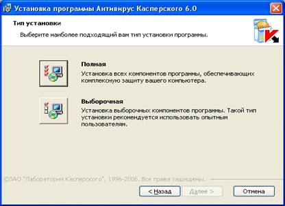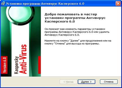 Установка ПО «Антивирус Касперского 6.0» осуществляется при помощи стандартного мастера установки Windows – InstallShield Wizard. Перед началом установки мастер распаковывает файлы установки в указанную папку (по умолчанию C:\kav\kav6.0\russian).