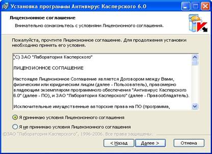 После завершения распаковки (в распакованном виде папка с установочными файлами занимает ~27,7 Мб) запускается «мастер установки программы Антивирус Касперского 6.0».