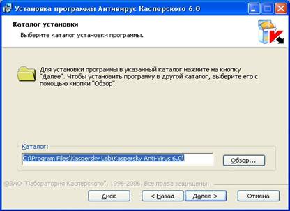 мастер установки запросит путь к каталогу, куда необходимо установить ПО (по умолчанию C:\Program Files\Kaspersky Lab\Kaspersky Anti-Virus 6.0\). Если заданный каталог не существует, то мастер автоматически его создаст.