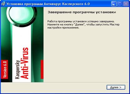 О завершении установки «мастер установки программы Антивирус Касперского 6.0» сообщает соответствующим окном и просьбой перезагрузить компьютер