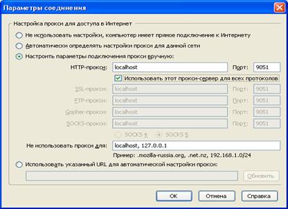 Рис. 16 Настройка браузера Firefox на работу с Proxy-сервером Tor