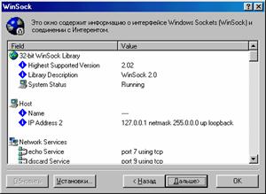 Сообщает о встроенных библиотеках подпрограмм Windows, осуществляющих связь с Internet (Рис.43). Эта утилита может работать только тогда, когда компьютер подключен к сети Internet, в противном случае утилита зависает. Полученные сведения о библиотеках могут быть полезны, если потребуется установить программы для работы в Internet. Утилита к тому же способна определить текущий IP-адрес компьютера.
