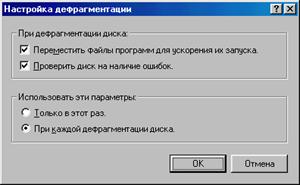 Кнопка Настройка позволит задать некоторые параметры дефрагментации (Рис.19). Вы сможете указать, надо ли перемещать наиболее часто используемые программы в начало диска для ускорения их запуска, надо ли проверять диск на наличие ошибок. Если вы только что проверили его Scandisk’ом, то последнюю галочку можно убрать. Но вообще убирать ее не следует: дефрагментация идет только до тех пор, пока Scandisk не наткнется на ошибку файловой системы. После этого вам предлагают все же проверить свой диск и исправить на нем ошибки.