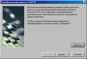 Для больших современных жестких дисков использование файловой системы FAT32 становится необходимостью, и вопросы преобразования к сегодняшнему дню уже отпали. Это, а также желание отказаться от поддержки режима MS-DOS, привело к тому, что в системе Windows Me средства поддержки преобразования в файловую систему FAT32 отсутствуют.
