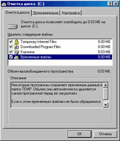 • Временные файлы. Многие приложения Windows при своей работе создают временные файлы для хранения каких-то частей обрабатываемой информации. По закрытии приложения или по исчезновении надобности в этих файлах они обычно автоматически уничтожаются, но иногда этого по каким-то причинам не происходит. Временные файлы обычно хранятся в каталогах C:\TEMP и C:\Windows\TEMP и уничтожению подвергаются давно не используемые