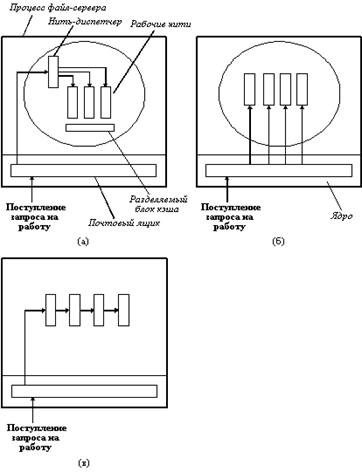 Один из возможных способов организации вычислительного процесса показан на рисунке 3.10,а. Здесь нить-диспетчер читает приходящие запросы на работу из почтового ящика системы. После проверки запроса диспетчер выбирает простаивающую (то есть блокированную) рабочую нить, передает ей запрос и активизирует ее, устанавливая, например, семафор, который она ожидает.