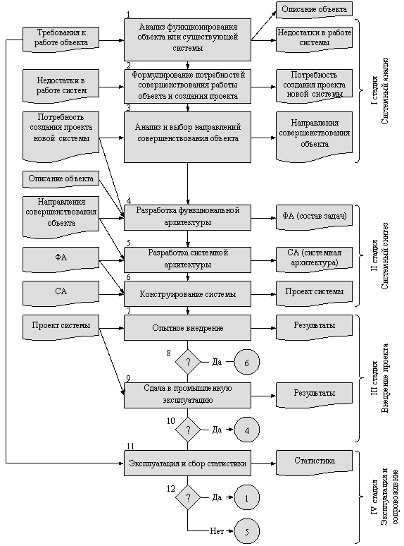 § третий цикл (блоки 9-10, 4-9) возникает после сдачи в промышленную эксплуатацию, когда выявляются ошибки в функциональной архитектуре системы, связанные с несоответствием проекта требованиям заказчика, по составу функциональных подсистем, составу задач и связям между ними;