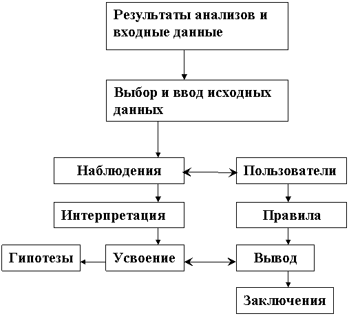 Качество ЭС определяется размером и качеством базы знаний (правил или эвристик). Система функционирует в следующем циклическом режиме: выбор (запрос) данных или результатов анализов, наблюдения, интерпретация результатов, усвоение новой информации, выдвижении с помощью правил временных гипотез и затем выбор следующей порции данных или результатов анализов (рис.2). Такой процесс продолжается до тех пор, пока не поступит информация, достаточная для окончательного заключения.