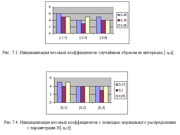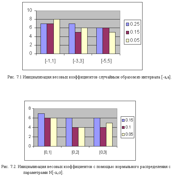 Для примера рассмотрим влияние процедуры начальной инициализации весовых коэффициентов и точности обучения на ошибку классификации. На рисунках 7.1 и 7.2 едставлены эти результаты.