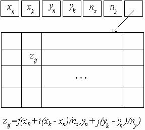 Данные для построения трехмерного графика (трехмерную таблицу) можно хранить следующим образом: 1) известно, что аргументы x и y могут принимать значения в своих пределах: x Î [xn,xk], y Î [yn,yk], с постоянным шагом по каждой переменной: xi = xn+i*hx, yi = yn+j*hy, где x,y – независимые переменные; xn, yn, xk, yk – соответственно, начальные и конечные значения пределов изменения переменных; hx = (xk-xn)/nx, hy = (yk-yn)/ny – соответственно, шаги по независимым переменным x, y (при построении графика). 2) для построения графика в этом случае достаточно хранить в первых 6-ти ячейках таблицы – xn, xk, yn, yk, nx, ny, а в 7-й ячейке – ссылку на таблицу значений z=f(xi,yi), с количеством строк nx, столбцов – ny.
