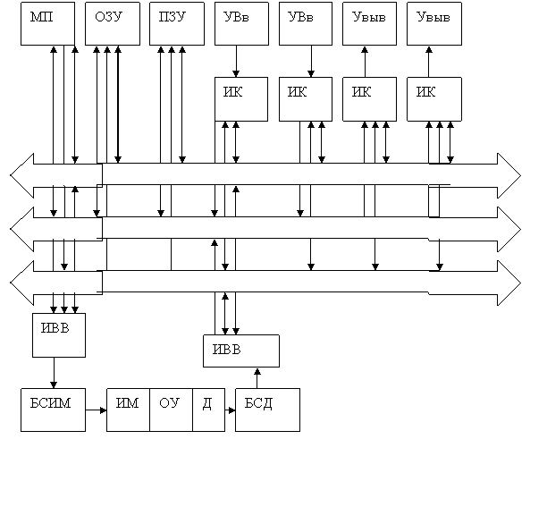 МП – микропроцессор; ОЗУ – оперативное запоминающее устройство; ПЗУ – постоянное запоминающее устройство; УВв – устройство ввода; УВыв – устройство вывода; ИК – интерфейсный канал; МУ – магистраль управления; МД – магистраль данных; МА – магистраль адреса; ИВВ – интерфейс ввода – вывода; БСИМ – блок сопряжения с исполнительными механизмами; ИМ – исполнительные механизмы; Д – датчики информации состояния объекта управления; БСД – блок сопряжения с датчиками.