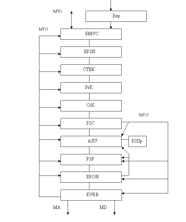 Если такое взаимодействие необходимо внешнему устройству, то внешнее устройство на магистраль Мупр. выставляет сигнал о таком взаимодействии. Т.к. внешних устройств бывает много, то обязательно нужен блок для анализа этих сигналов от внешних устройств и выбирал из них тот сигнал, который на данный момент наиболее важный. Для целей служит Бпр, который выбирает один сигнал из множества пришедших и посылает его на БМУС. Этот блок необходим для осуществления подготовительных операций для организации прерывания. Как только эти команды готовы МП прерывает ее выполнение(основной программы) и все данные прерванной команды посылаются в СТЭК. Это необходимо для того чтобы после обработки прерывания МП мог вернуться в исходное состояние при прерывании программ. В регистр команд записывается(РгК) – информация о первой команде, выполняемой в подпрограмме. Одновременно с этим в СчК записывается номер ячейки памяти, где хранится вторая команда. В РгС заносится информация о том, что делает МП в данный момент и эта информация выносится за пределы МП в МП систему. После чего информация поступает в АЛУ и происходит выполнение команды по преобразованию данных. АЛУ далее записывает в РгПр признаки, характеризующие выполненную операцию. Одновременно с записью признаком информации из АЛУ передается РгР, где эти результаты хранятся или передаются, затем во внутреннюю или внешнюю память МП системы или эта информация через БУВв тому блоку, с которым взаимодействовал МП.