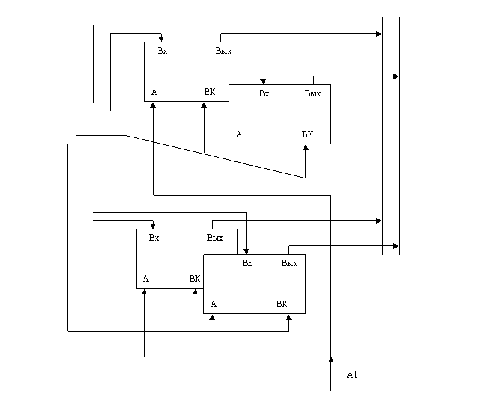 При записи информации в t1 на ШО выставляются данные. В этот же момент подаётся сигнал ВК, разрешающий работу ЗУ. Эти данные поступают на вход ЗУ, но сигнал РЗ подаётся только в момент t2 с задержкой tзад2. Это необходимо, чтобы исключить переходные процессы на внешних шинах при включении информации. В моменты t2 и t3 информация записывается в ячейку памяти и в момент t3 сигнал с РЗ снимается. Этот сигнал снимается раньше на время tзад3 , для того чтобы исключить влияние переходных процессов. В момент времени t4 снимаются все сигналы с ЗУ и внешних шин. ЗУ переходит в режим хранения информации. Схема наращивания разрядности ячеек памяти.