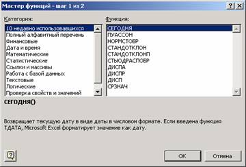 «Дата и время» - работа с датами, функции ТДАТА() – выдают текущую дату или текущее время в зависимости от формата ячейки.
