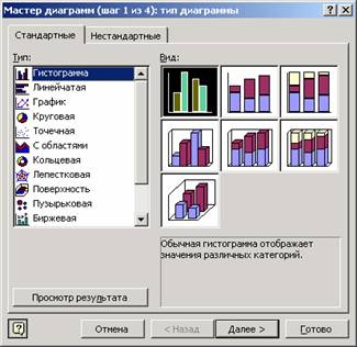 или главное меню Вставка – Диаграмма. При этом открывается мастер создания диаграмм, который состоит из четырех шагов. На первом шаге определяется тип диаграммы: обычно это Гистограмма, График или Круговая. После выбора типа диаграммы нажмите Далее>>