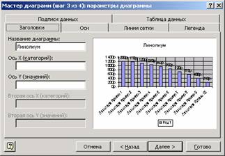 На третьем шаге определяются основные параметры диаграммы: Заголовок, Оси, Линии сетки, Легенда (подписи при наличии нескольких рядов), подписи данных.