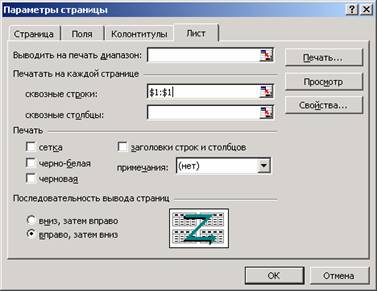 Для печати больших таблиц для отображения заголовка таблицы на каждой странице необходимо открыть главное меню Файл-Параметры страницы и на закладке Лист установить способ нумерации страниц, а также в строчке сквозные строки установить диапазон строк шапки таблицы (см. рис)