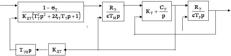 Т – его относительная статическая ошибка, вызванная действием внутренней обратной связи по ЭДС двигателя. КДТ – коэффициент передачи датчика тока. RЭ – эквивалентное сопротивления якорной цепи двигателя. С – постоянная двигателя., ТМ, ТР – электромеханические постоянные времени двигателя и рабочего органа. ТУН – постоянная времени гибкой о.о.с. по упругому току. СУ, КТ – жесткость упругого звена и коэффициент сил вязкого трения, приведённые к двигателю.