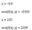 Функция root(f(x), x) – находит корень уравнения с одним неизвестным. Возвращает значение x,при котором функция f(x) равна нулю. Использование функции root требует предварительного задания начального значения. Если исследуемая функция имеет много корней, то найденный корень будет зависеть от начального приближения. Если оно расположено близко к локальному экстремуму функции f(x), функция root может не найти корня, либо найденный корень будет далеко от начального приближения.