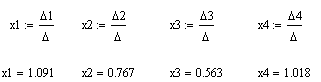 Запишем в рабочей области программы систему уравнений (ограничения) и, воспользовавшись функцией find(x, y, …) найдем корни этой системы. Так как система имеет более одной неизвестной ответ получим виде вектора, элементы которого есть искомые значения х1, х2, х3, х4 соответственно.