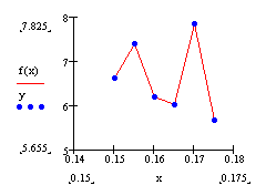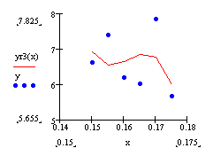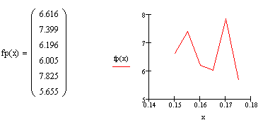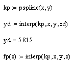 Функция interp(vs, vx, vy, x) – возвращает интерполированное значение в точке х, полученное с помощью кубических сплайнов на основе данных, представленных в векторах vx и vy.