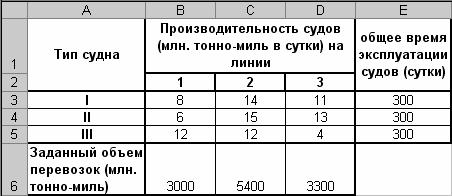 Также как и в примере решения в MathCAD, возьмем x1 за то, сколько времени (суток) нужно использовать первое судно на первой лини и т.д. В MS Excel решение будем искать с помощью встроенного макроса «Поиск решения». Первоначально составим таблицу с исходными данными (рис. 1.1). Затем присвоим x-ам первоначальные значения равные нулю и зададим ограничения.