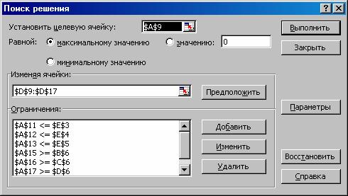 В окне «Поиск решения» (рис. 1.2) устанавливаем ссылки на ячейки с целевой функцией, изменяемыми значениями иксов и ограничениями.