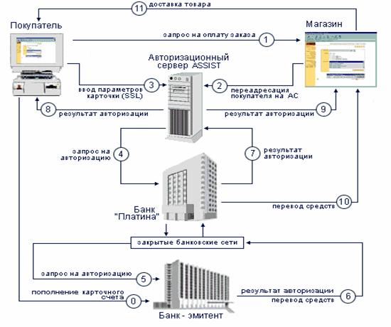 1. Покупатель через Интернет подключается к Web-серверу Магазина, формирует корзину товаров и выбирает форму оплаты по кредитным карточкам.