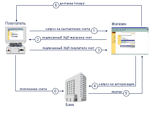 1. Покупатель через Интернет подключается к Web-серверу Магазина, формирует корзину товаров и направляет Магазину запрос на выставление счета.