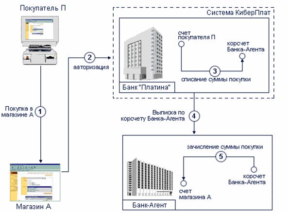 При покупке покупателем - клиентом КБ "Платина" в магазине - клиенте Банка-Агента (1) в результате авторизации (2) сумма покупки списывается со счета покупателя - клиента КБ "Платина" и зачисляется на корреспондентский счет Банка-Агента в КБ "Платина" (3) за вычетом комиссионного вознаграждения. Банк-Агент по полученной выписке (4) зачисляет указанную сумму на счет своего клиента - магазина (5).