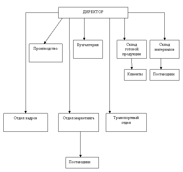 Фабрика по производству трикотажных изделий «Полесье» имеет следующую взаимосвязанную структуру: директор, бухгалтерия, отдел кадров, отдел маркетинга, склад готовой продукции и материалов, производственный отдел (производство).