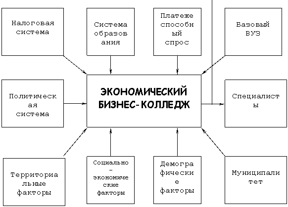 Как я уже говорила, за систему в данной контрольной работе я приняла Экономический бизнес-колледж г.Москвы (ЭБК). На организацию (систему) находящуюся как в рентабельном так и нерентабельном состоянии (в данном случае в рентабельном) влияют многие внешние факторы, которые в понятиях рыночной экономики называют «макроокружением», а с точки зрения ТО и СА – внешней средой.