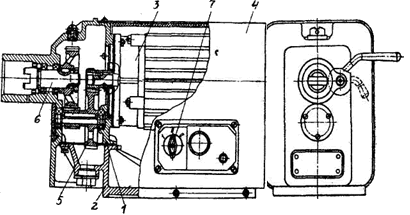 / -редуктор; 2 - картер; 3 - электродвигатель; 4 - кожух; 5 - зубчатое колесо; 6 - приводной вал; 7 - переключатель скорости